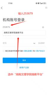 ②:第一行输入单位UC码“253679”点击下方提示框内的“湖南文理学院继教平台”